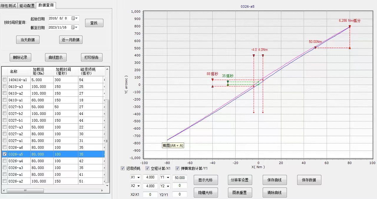扭轉剛度測試時,滯回曲線上扭矩為零時的回轉角,與剛度、空程綜合輸出評定結果并繪制遲滯曲線,可獨立輸出誤差曲線報告。
